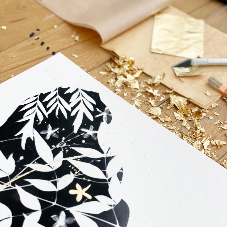 Each print is a unique, hand-finished artwork. After printing, I add Gold Leaf details (or Silver - on demand) where I feel inspired on the day, making every piece truly one-of-a-kind.