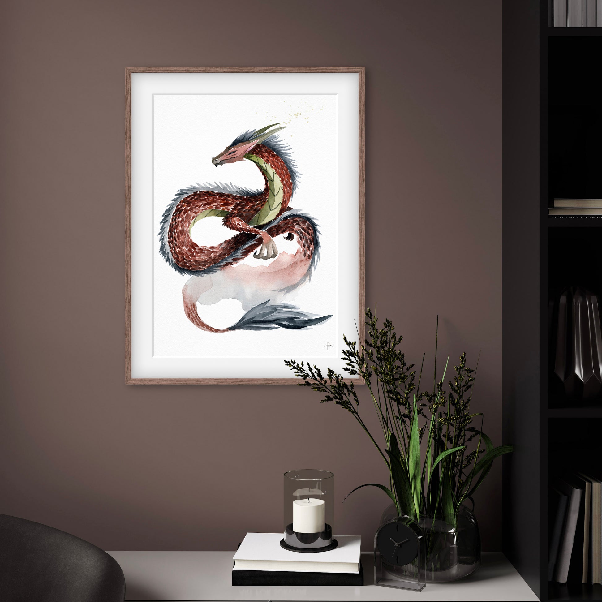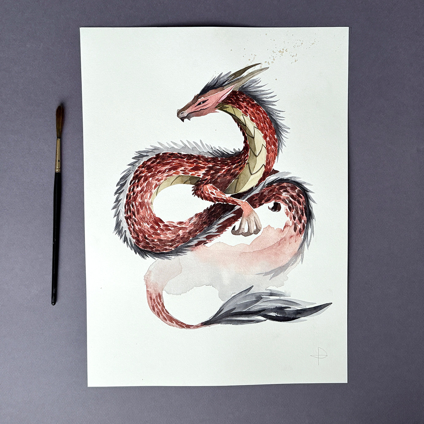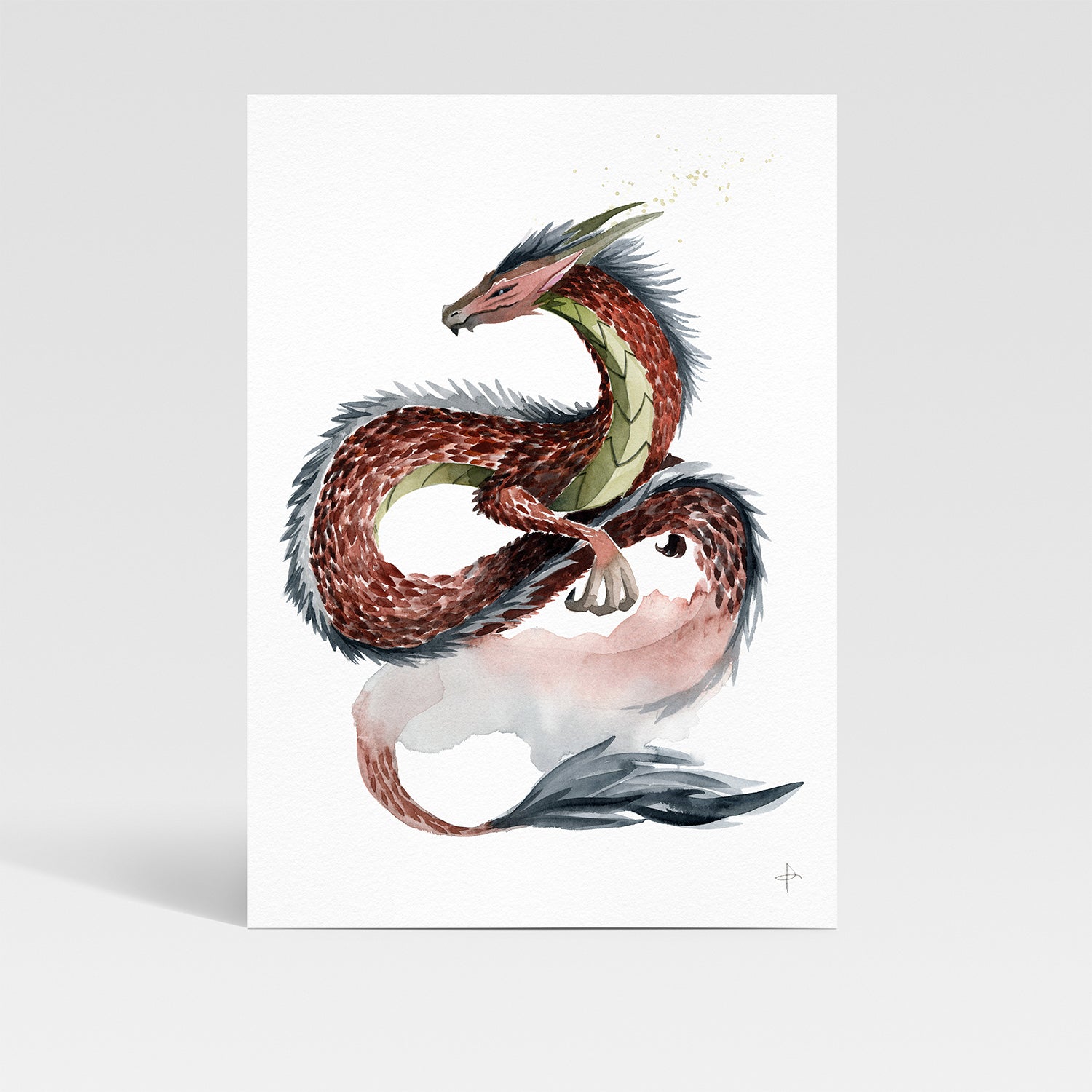 This whimsical dragon watercolour illustration was originally commissioned for Stonemaier Games' Wyrmspan boardgame, capturing the fun-loving spirit of fantasy dragon art.