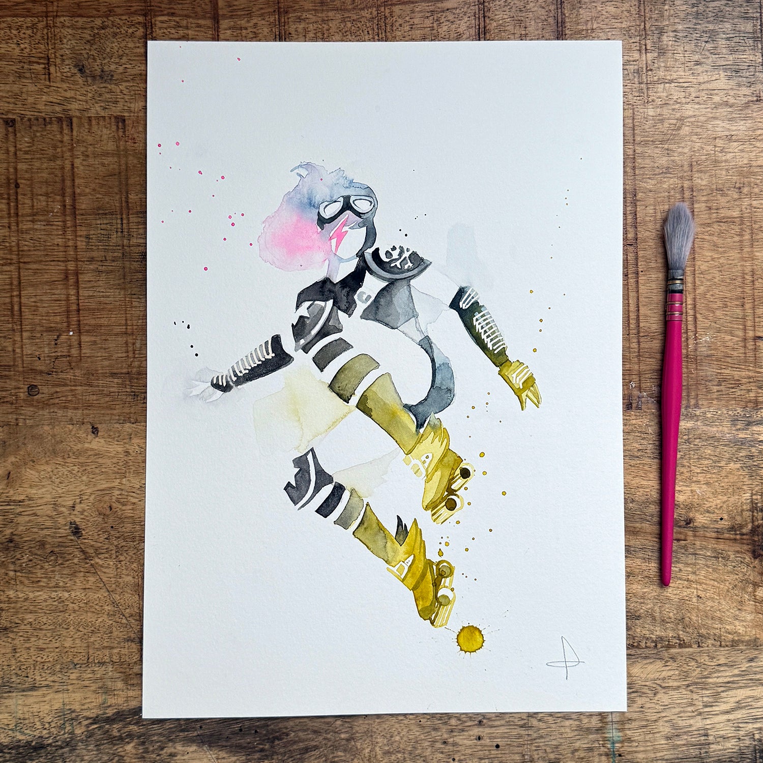 Once a derby queen, now a blur on wheels: Rolling Stone races through chaos with golden speed and pink fury. No villain can match her rhythm, no injustice escapes her spin. When you hear the click-clack in the dark… justice is already rolling your way.