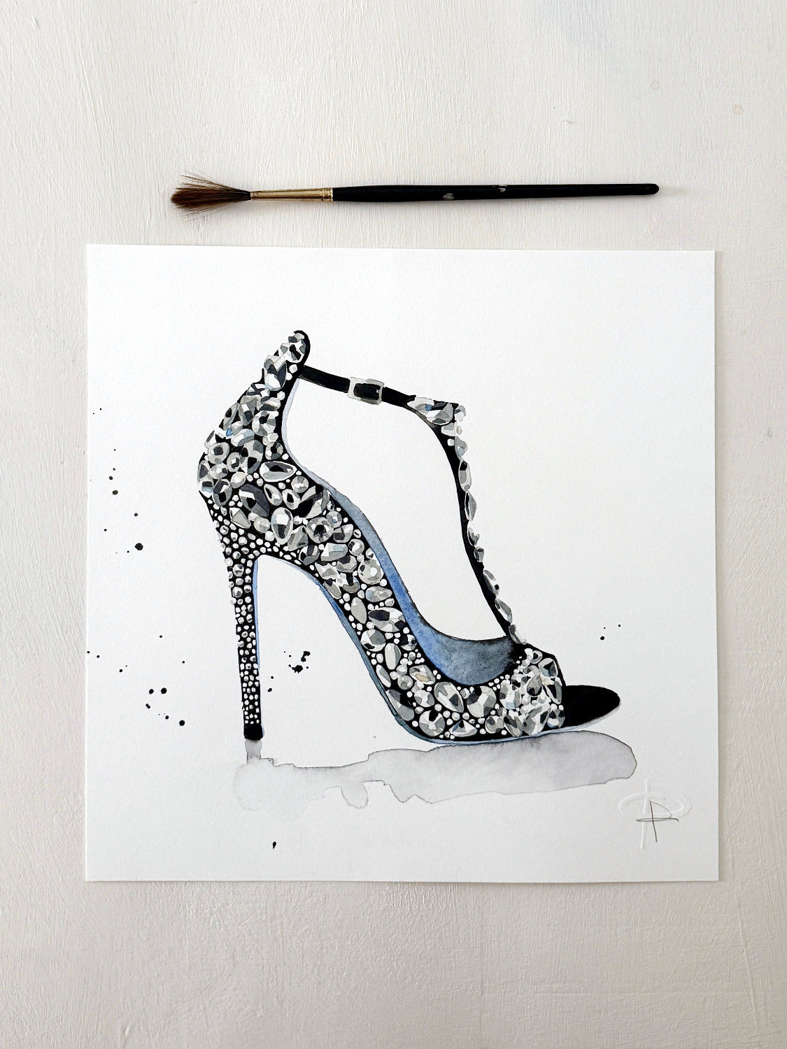 An original watercolour painting from the exclusive Jimmy Choo Momento collection, created to celebrate the brand's 20th anniversary. Commissioned for the luxurious Shoe Trunk showcase, these hand-painted illustrations captured every intricate detail—from crystals and velvet to metallic finishes and embroidery—of 20 stunning red carpet designs.