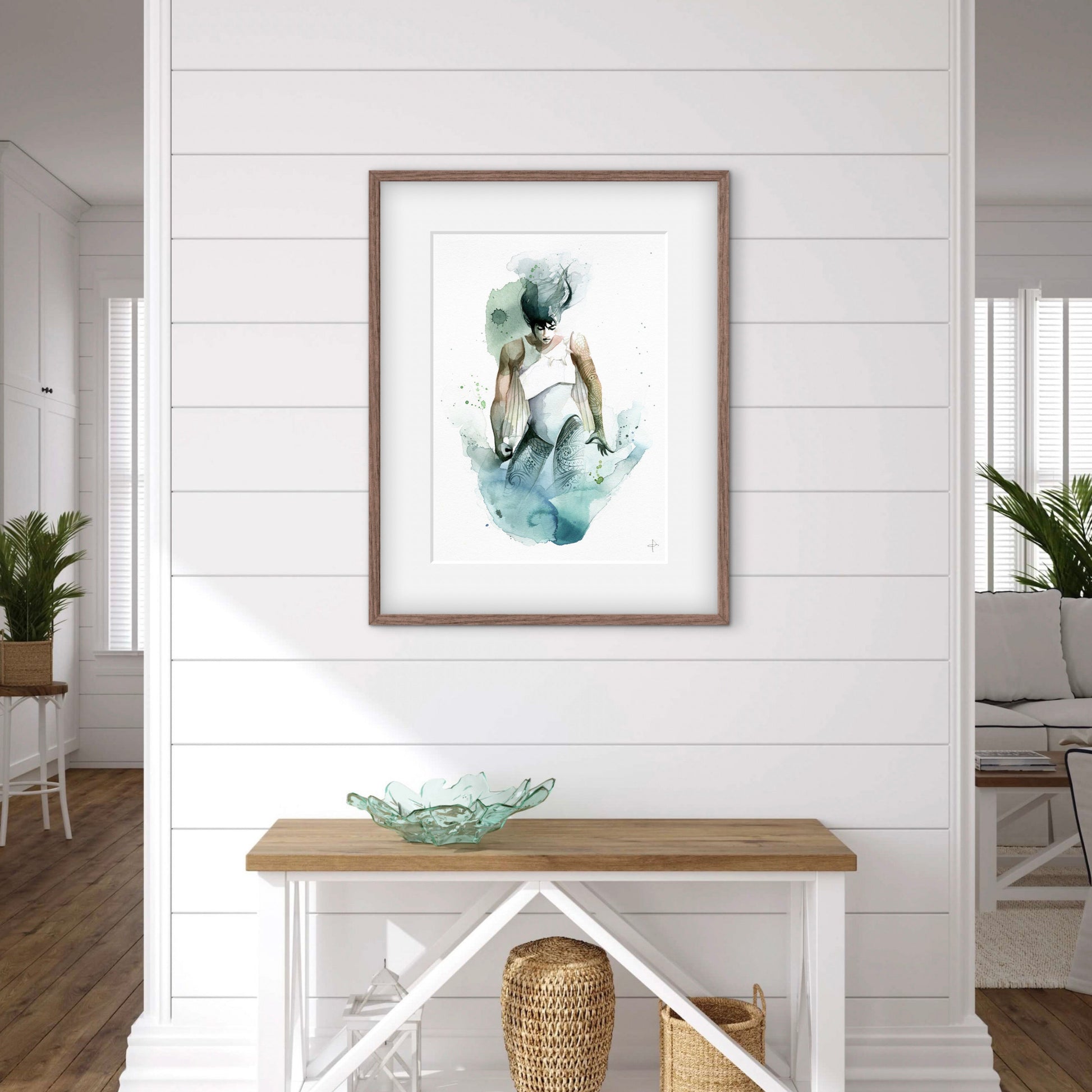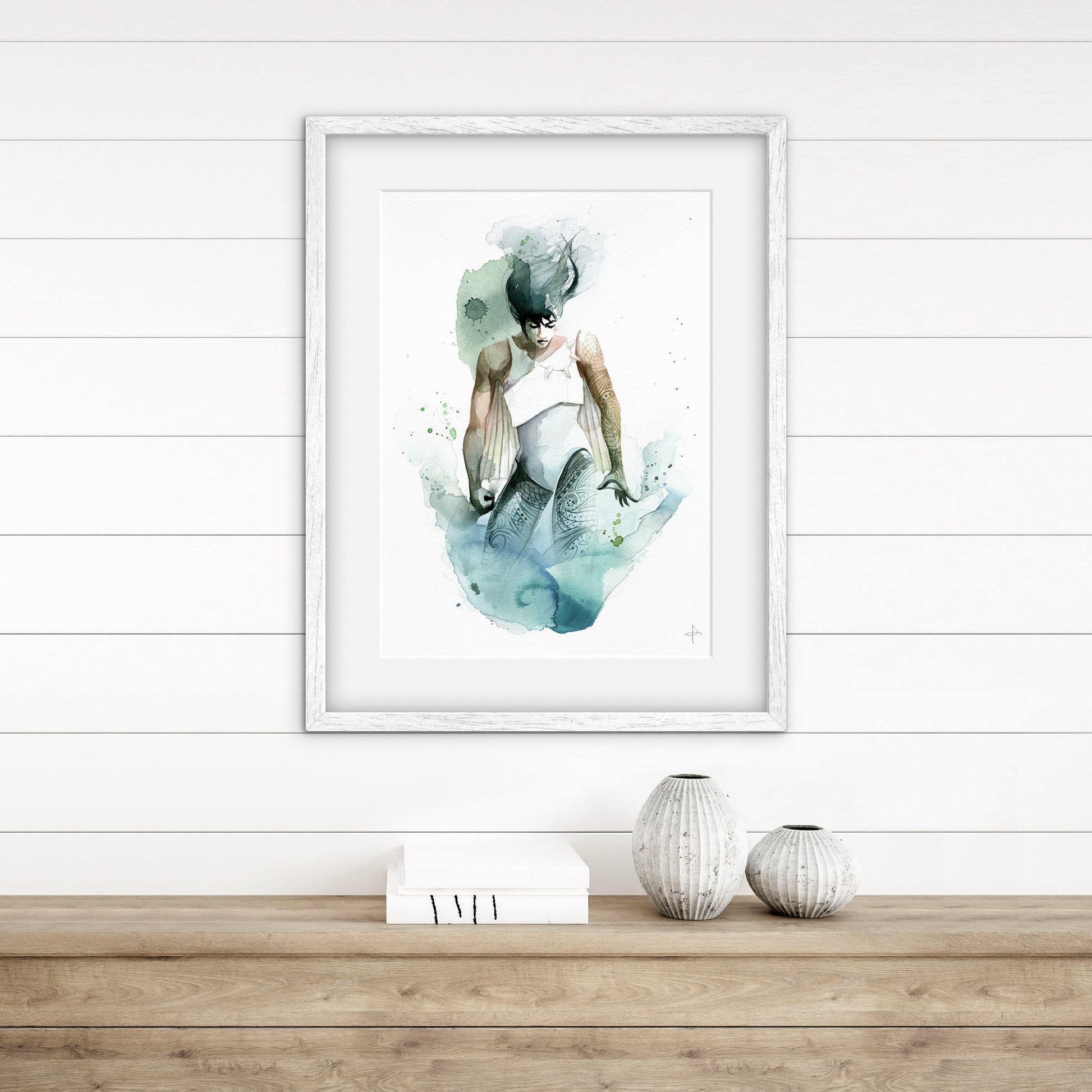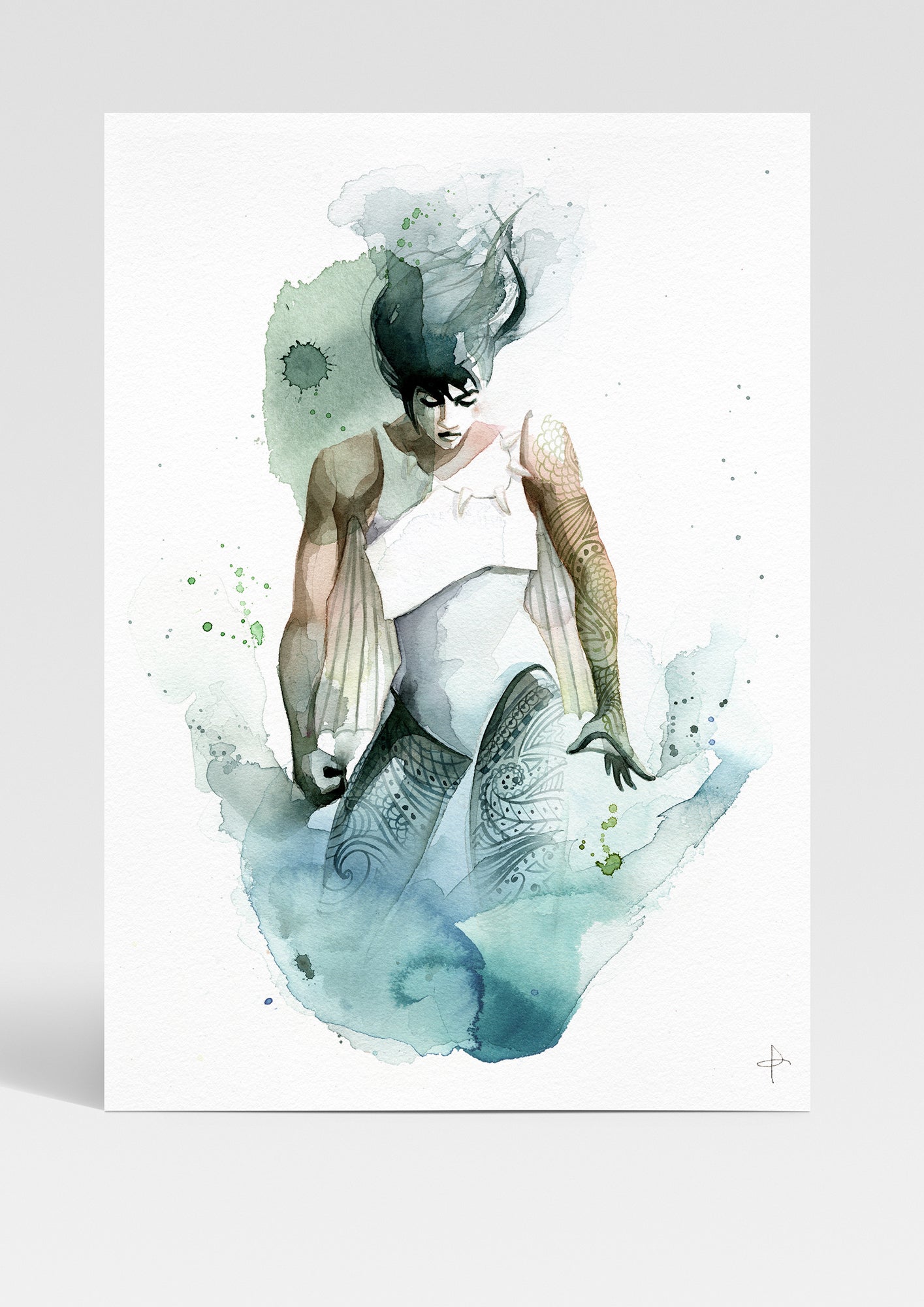 A mystical water-powered being from Origin Story: illustrated in flowing watercolours.